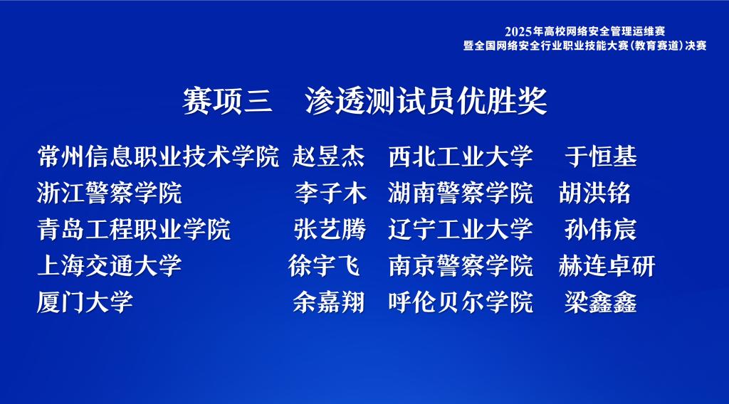 近日,由教育部教育管理信息中心指导、中国教育技术协会主办,中国教育技术协会网络安全专委会、上海交通大学、北京大学承办的“2025年高校网络安全管理运维赛暨全国网络安全行业职业技能大赛(教育赛道)”在上海交通大学圆满落幕。本次大赛自2025年8月启动以来,吸引了全国704家教育行政单位和高校的2246名师生积极参与,在此项全国性的高水平赛事中,我校网络中心教师魏巍,荣获网络安全管理员赛项全国二等奖;梁鑫鑫,荣获渗透测试员赛项优胜奖,充分展现了我校在网络安全领域的专业实力。
