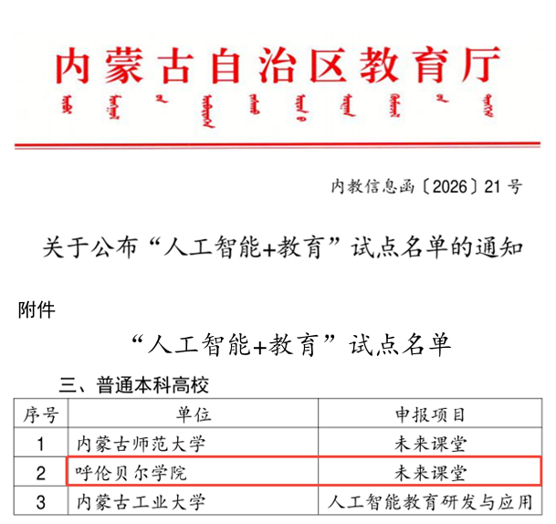 近日,内蒙古自治区教育厅印发《关于公布“人工智能+教育”试点名单的通知》(内教信息函〔2026〕21号),我校成功入选自治区“人工智能+教育”未来课堂项目普通本科高校试点单位,成为全区首批开展该试点工作的本科高校之一。