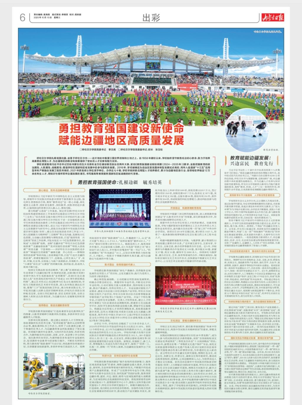 近日,内蒙古日报整版刊发我校党委书记李文阁,校党委副书记、校长张玉柱文章《勇担教育强国建设新使命 赋能边疆地区高质量发展》,文章系统介绍了学校始终坚守教育戍边初心使命,通过强化思想政治引领、优化学科专业布局、提升师资队伍水平、推进教育教学改革、加强对外交流合作等举措,致力于培养适应边疆地区经济社会发展需求的应用型人才,在人才培养、科学研究、社会服务、文化传承等方面为边疆地区的稳定和发展提供了坚实的人才支撑和智力支持。